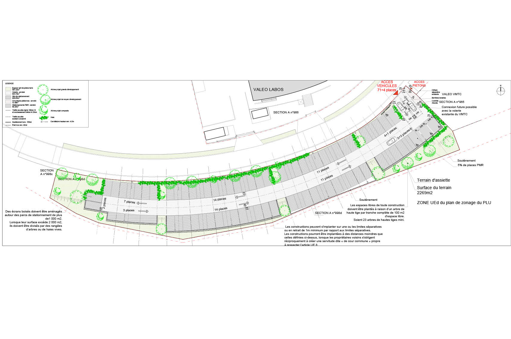 Le présent projet de déclaration préalable concerne l’aménagement d’un parking de 73 places à usage privatif, pour les salariés de VALEO. L’accès des véhicules se fera moyennant la création d’un bateau et d’un portail au NORD-EST de la parcelle sur la rue Costantini.